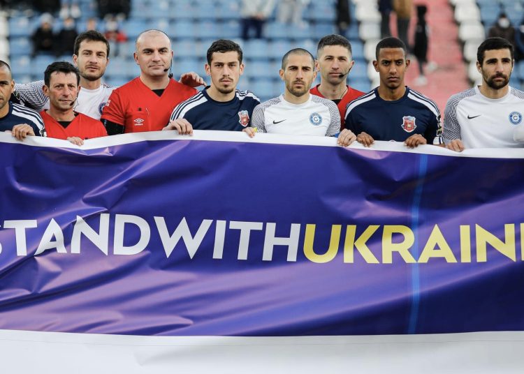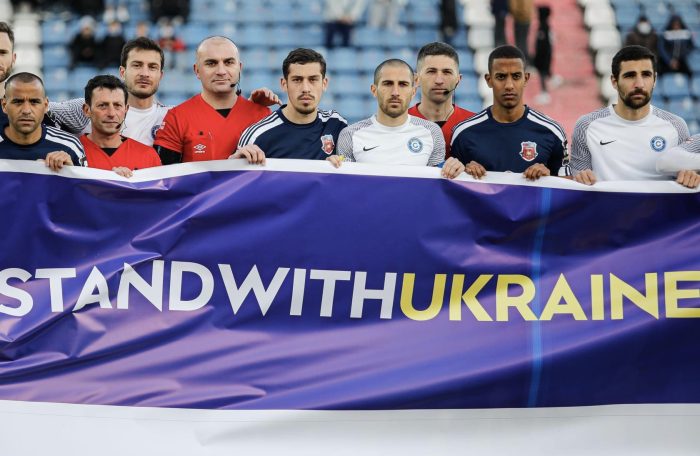 შეხვედრის წინ გუნდებმა უკრაინას მხარი “ჩვენ ვდგავართ უკრაინასთან ერთად” ბანერით დაუჭირეს.