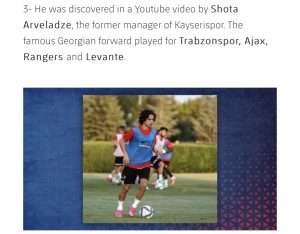 “ის იუთუბის ვიდეოში შოთა არველაძემ აღმოაჩინა, “ქაიზერისფორის” ყოფილმა მწვრთნელმა. ცნობილ ქართველ თავდამსხმელს “ქაიზერისფორში”, “აიაქსში”, “რეინჯერსსა” და “ლევანტეში” უთამაშია”