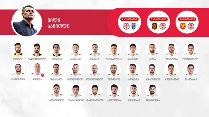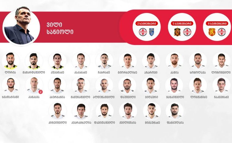 უახლოესი სამი მატჩისთვის ვილი სანიოლმა 26 ფეხბურთელი გამოიძახა. მათ შორის, ხუთი დებიუტანტი, რომელთაგან ოთხი საქართველოს კრისტალბეთ ეროვნულ ლიგას წარმოადგენს.