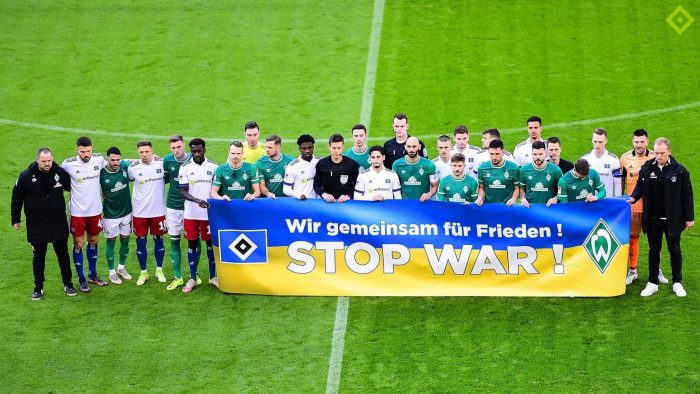 შეხვედრის წინ გუნდებმა უკრაინას მხარი “შეაჩერეთ ომის” ბანერით დაუჭირეს, რომელიც უკრაინის ფერებში იყო დამზადებული.